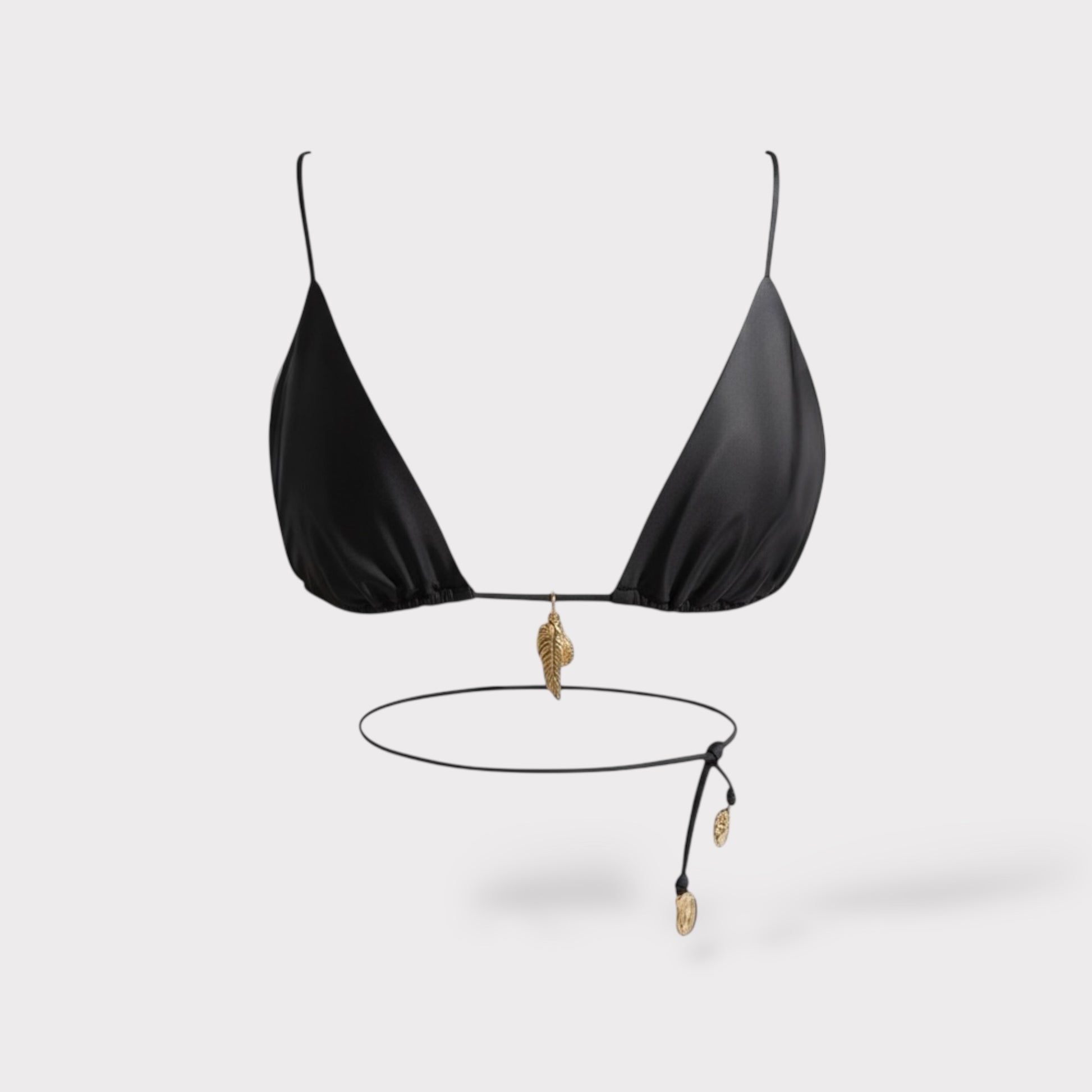 A shiny leather-looking bikini top with gold accents takes the glam factor up a notch, creating a luxurious and eye-catching swimwear piece. The shiny material retains its glossy finish, mimicking leather while showcasing a stunning sheen. The addition of gold accents make it a statement.