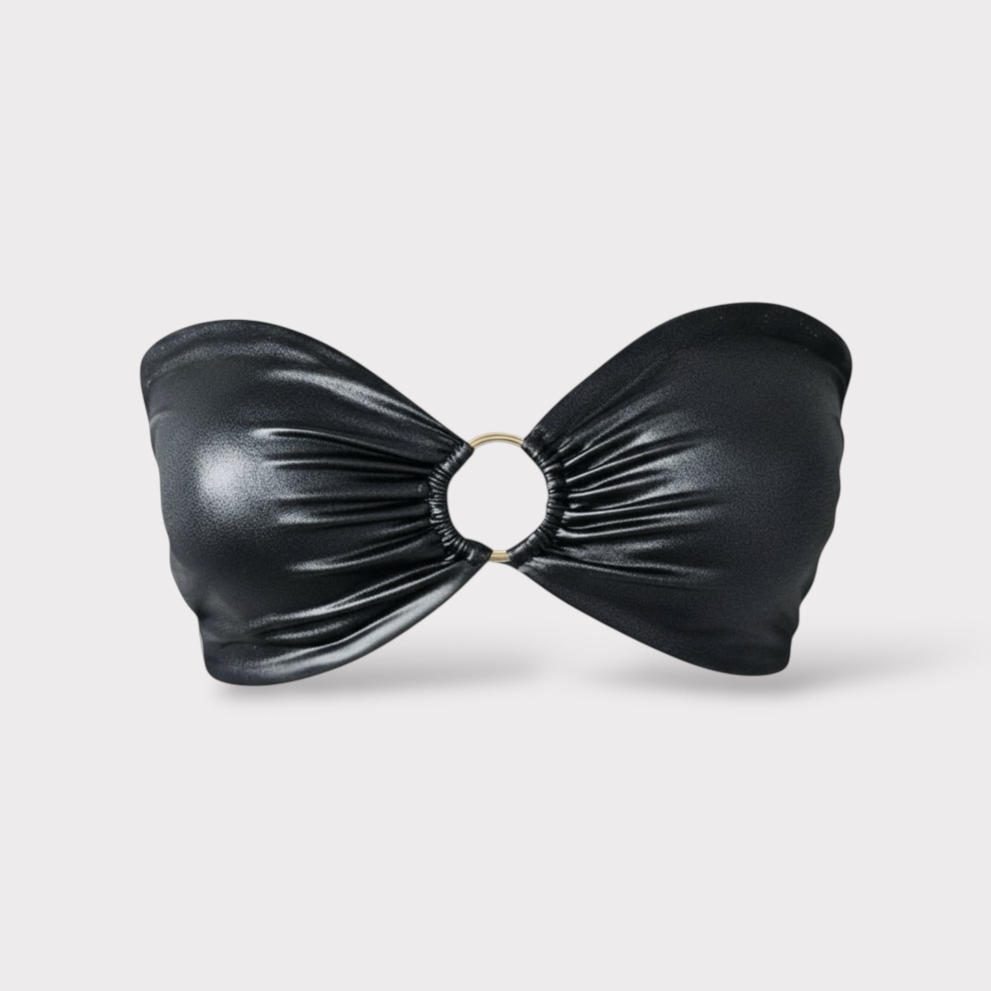 - Elevate your beach look with this strapless bikini top, made from a shiny luxury fabric that exudes sophistication. The back features an adjustable tie for a customizable fit, while a polished gold circle accent at the center adds a touch of refined glamour. Sleek, modern, and effortlessly chic β perfect for making a statement under the sun.
